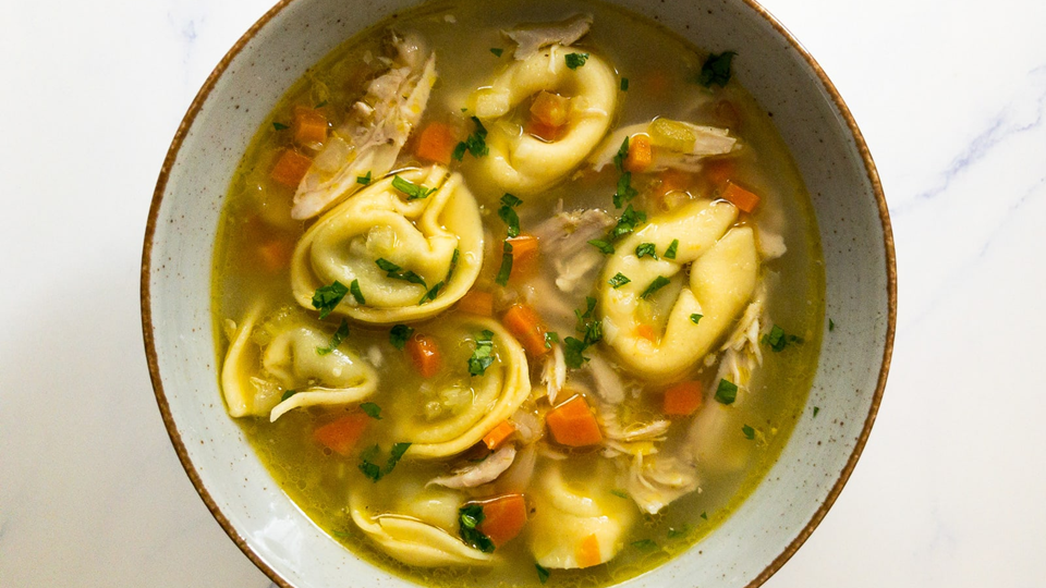 Add the stock, chicken, tortellini, and spices. Simmer for 10 minutes.