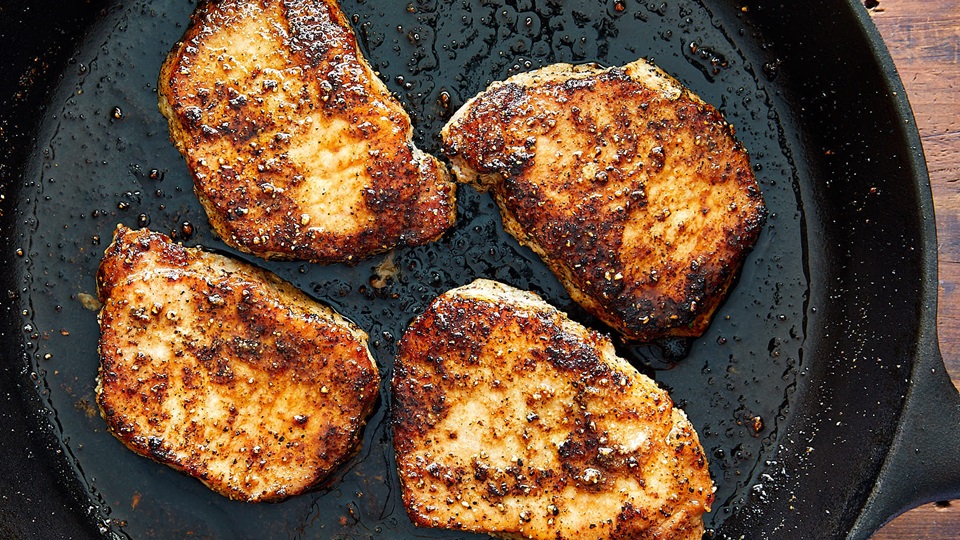Sear the chops on one side for about 3-4 minutes. Flip and continue frying for another 3-4 minutes or until internal temperature reaches 145F.