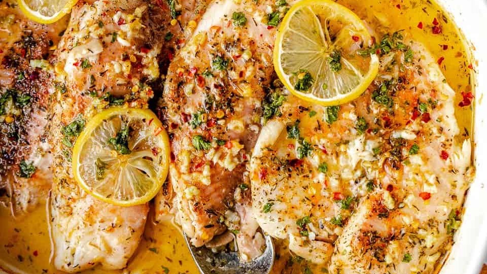 Mix together the melted butter, garlic, and lemon juice; pour over tilapia.